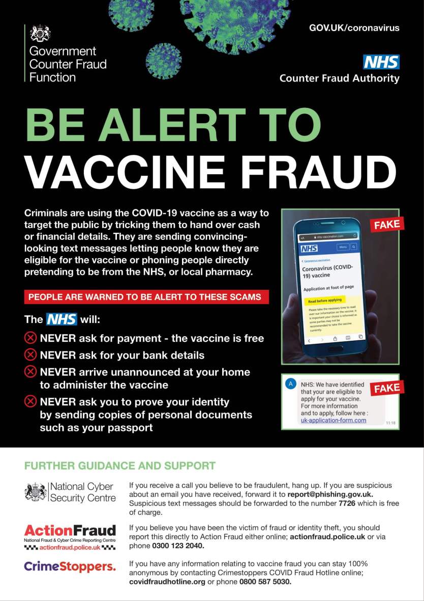 The government has issued a scam alert for vaccine fraud. Be alert.